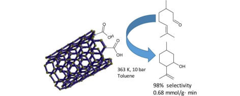 (64) A.B. Dongil, L. Pastor-Pérez, J.L.G. Fierro, N. Escalona, A. Sepúlveda-Escribano Effect of the surface oxidation of carbon nanotubes on the selective cyclization of citronellal Applied Catalysis A:Gen A 524 (2016) 25-31 [Link]